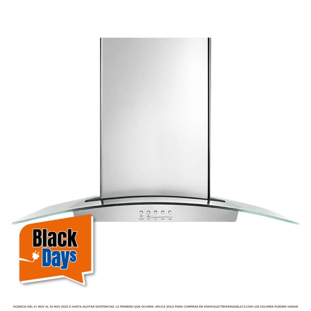 • Campana extractora tipo isla de 36″ con vidrio decorativo