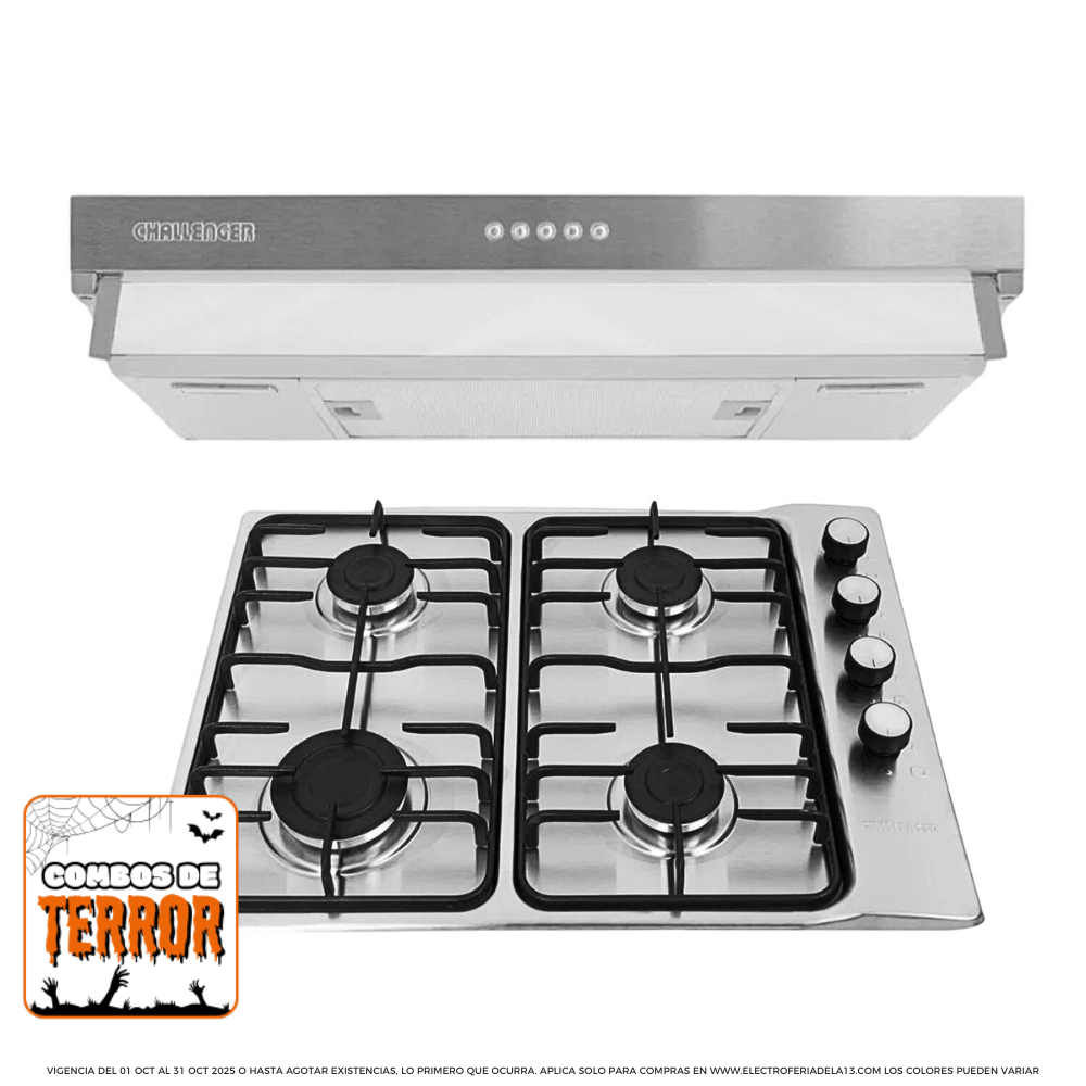 Dale un toque moderno y funcional a tu cocina con este combo Challenger, compuesto por una estufa empotrable y una campana extractora de diseño horizontal. Una combinación ideal para quienes buscan eficiencia, estética limpia y facilidad en la instalación.