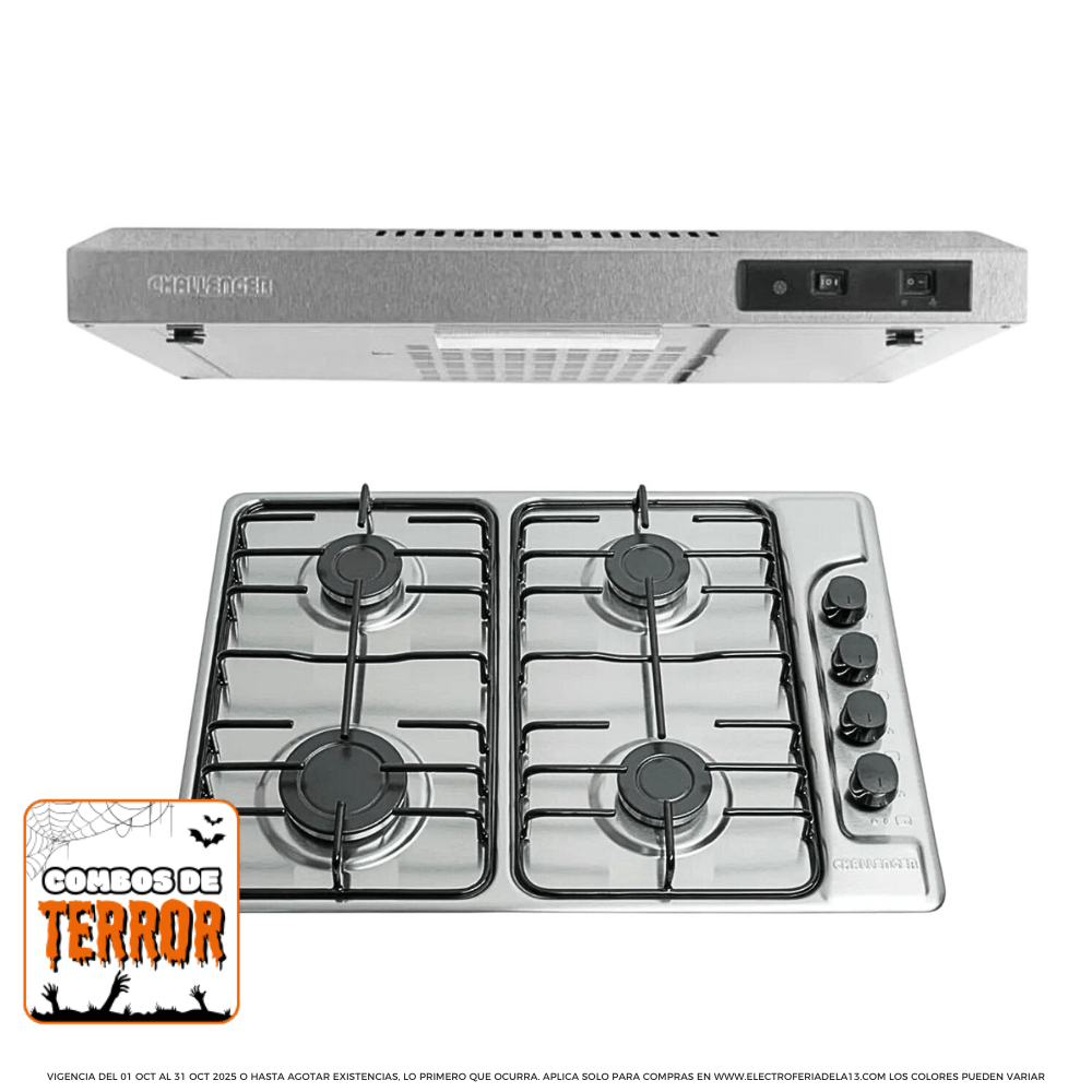 Este combo incluye una estufa empotrable de 58.5 cm y una campana decorativa tipo chimenea de 60 cm, ambas con acabado en acero inoxidable. Un conjunto perfecto para quienes buscan elegancia, potencia y eficiencia en su cocina.