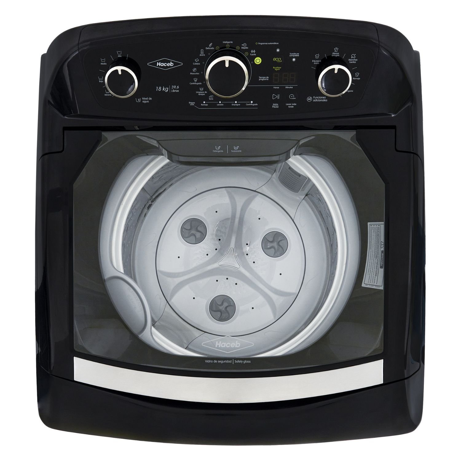 • Programas: Inteligente, Rápido, Fuerte, Delicado, Jeans, Cobijas, Centrifugado, Limpieza de tanque, Tenis.
